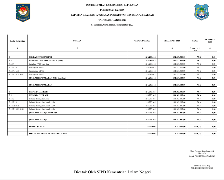 Informasi Laporan Realisasi Anggaran Seluruh SKPD-DINKES-PKM TATABA T.A 2023