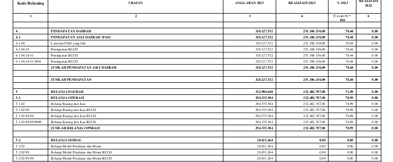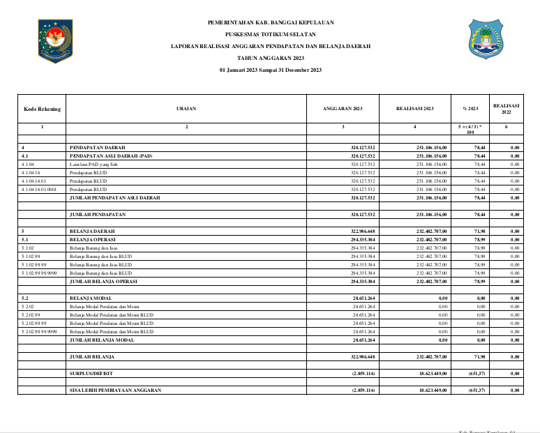 Informasi Laporan Realisasi Anggaran Seluruh SKPD-DINKES-PKM TOTIKUM SELATAN T.A 2023