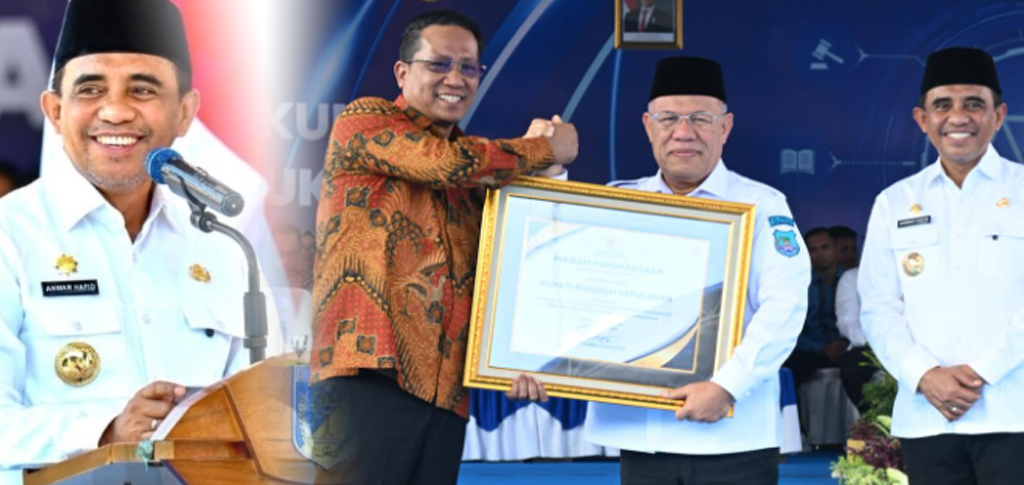 poto: Bupati Banggai Kepulauan Rusli Moidady menerima penghargaan Nasional, diapit oleh Menteri Hukum RI Dr. Supratman Andi Agtas dan Gubernur Sulawesi Tengah Anwar Hafid, sebagai bentuk apresiasi atas komitmen menghadirkan akses keadilan hingga tingkat desa.