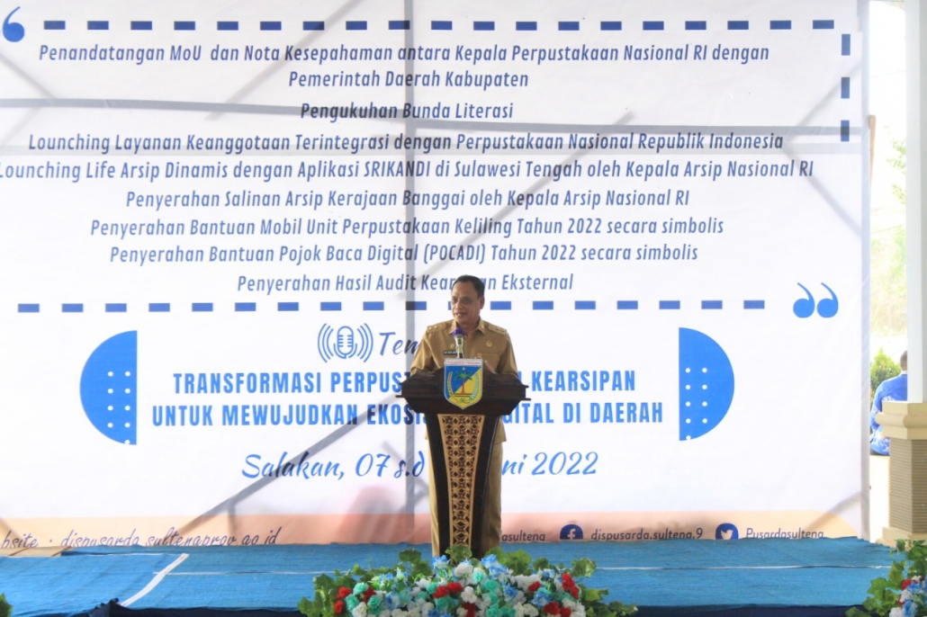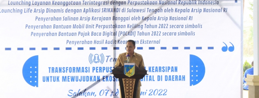 “Untuk itu, saya anggap perlu dilaksanakan launching layanan keanggotaan terintegrasi dengan perpustakaan Nasional RI sehingga pemustaka kita di Sulawesi Tengah dapat menjadi anggota perpustakaan Nasional sehingga dapat mengakses informasi secara digital dan launching live arsip dinamis dengan aplikasi Srikandi sebagai satu-satunya aplikasi dalam penerapan sistem pemerintah berbasis elektronik serta penyerahan salinan arsip Kerajaan Banggai dari arsip Nasional RI,” jelas Wagub.